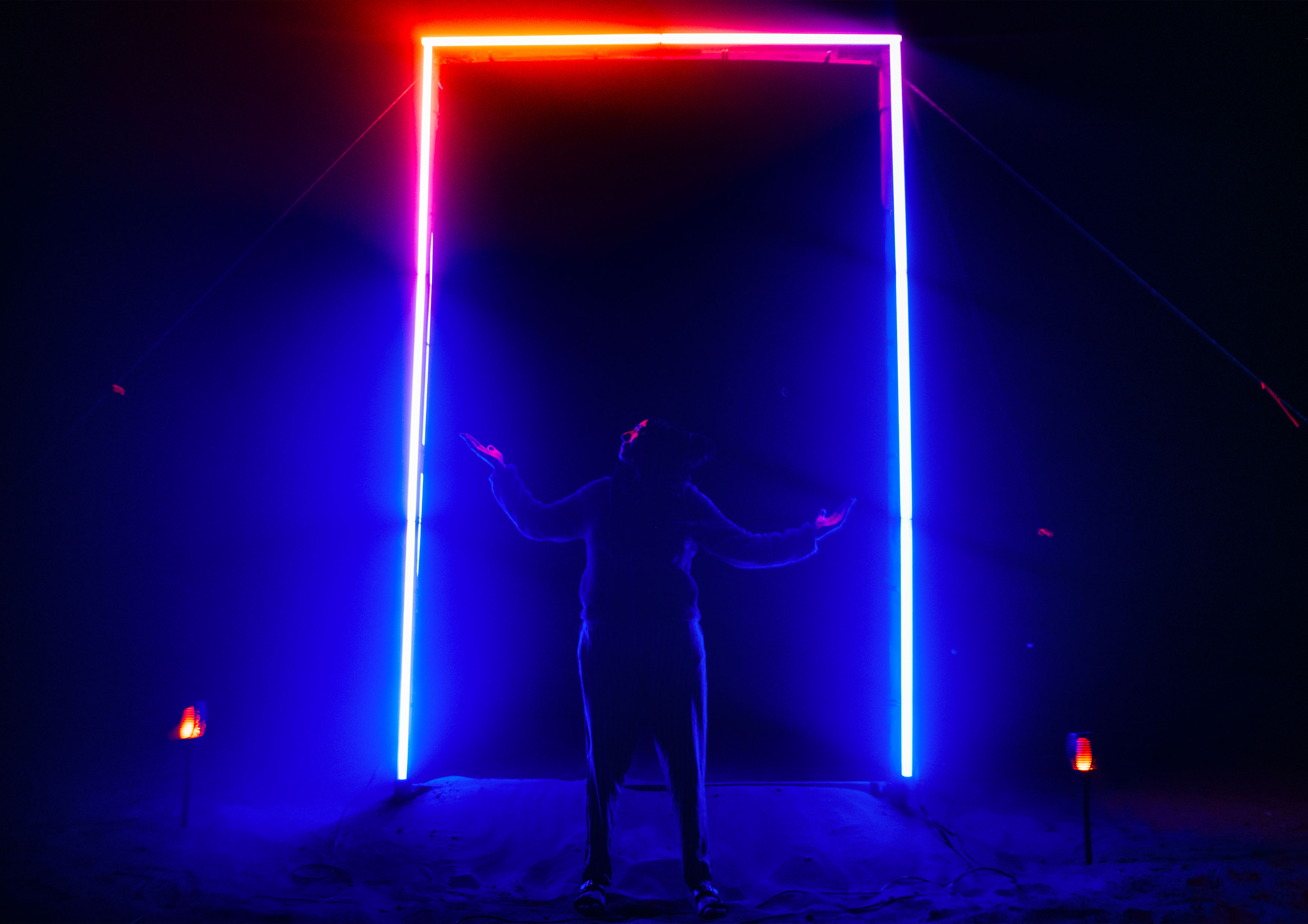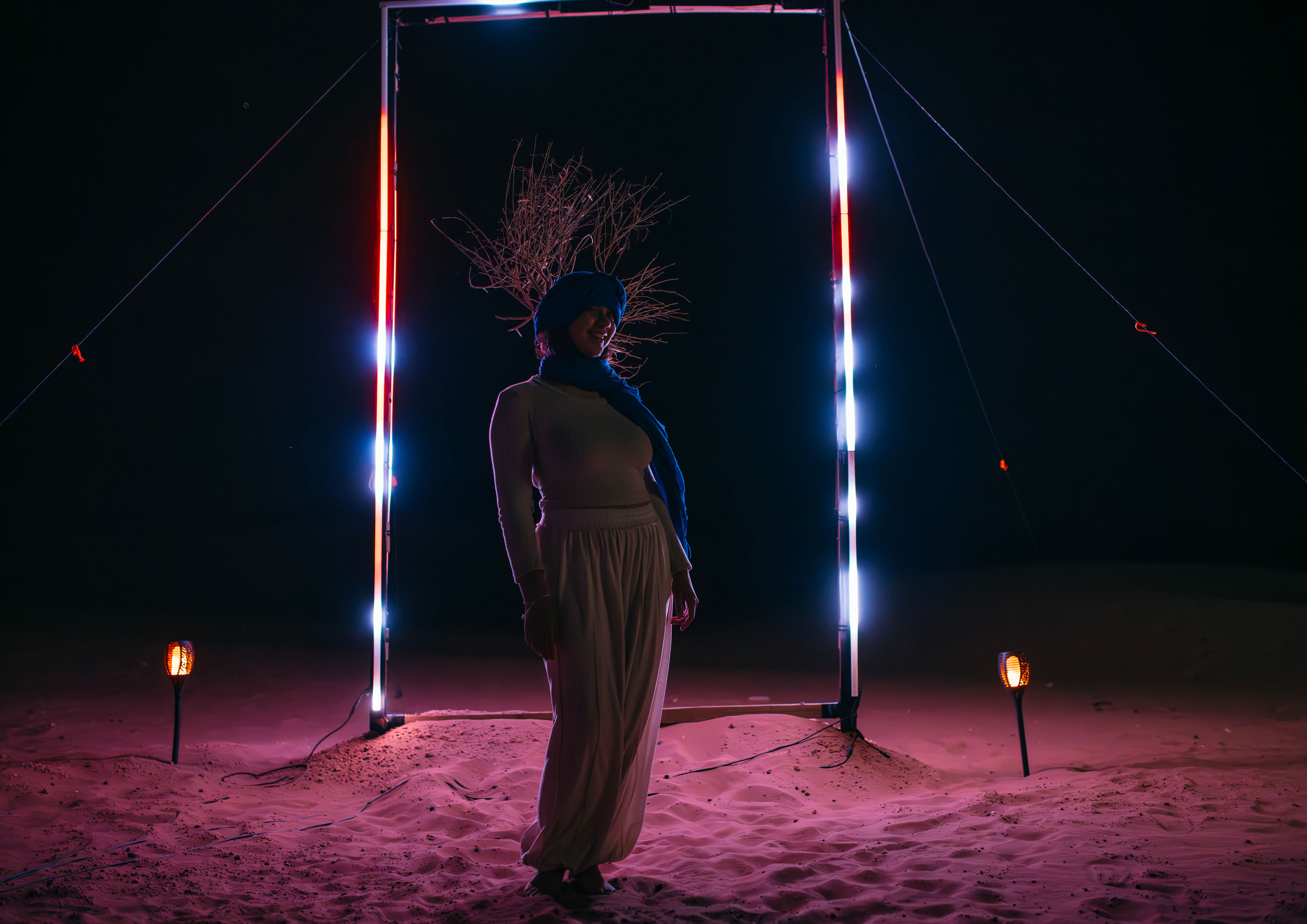 Since 2024, she has been collaborating with Lab9, a light design studio, to create immersive installations that combine light, sensors, and generative visuals designed for festivals, exhibitions, and international brands. D-GATE, created in the Sahara Desert during the Live Performers Meeting, curated by flyer new media in M'Hamid El Ghizlane (Morocco), is a 3-meter-high interactive light portal that reacts to human presence and the surrounding ambient temperature.